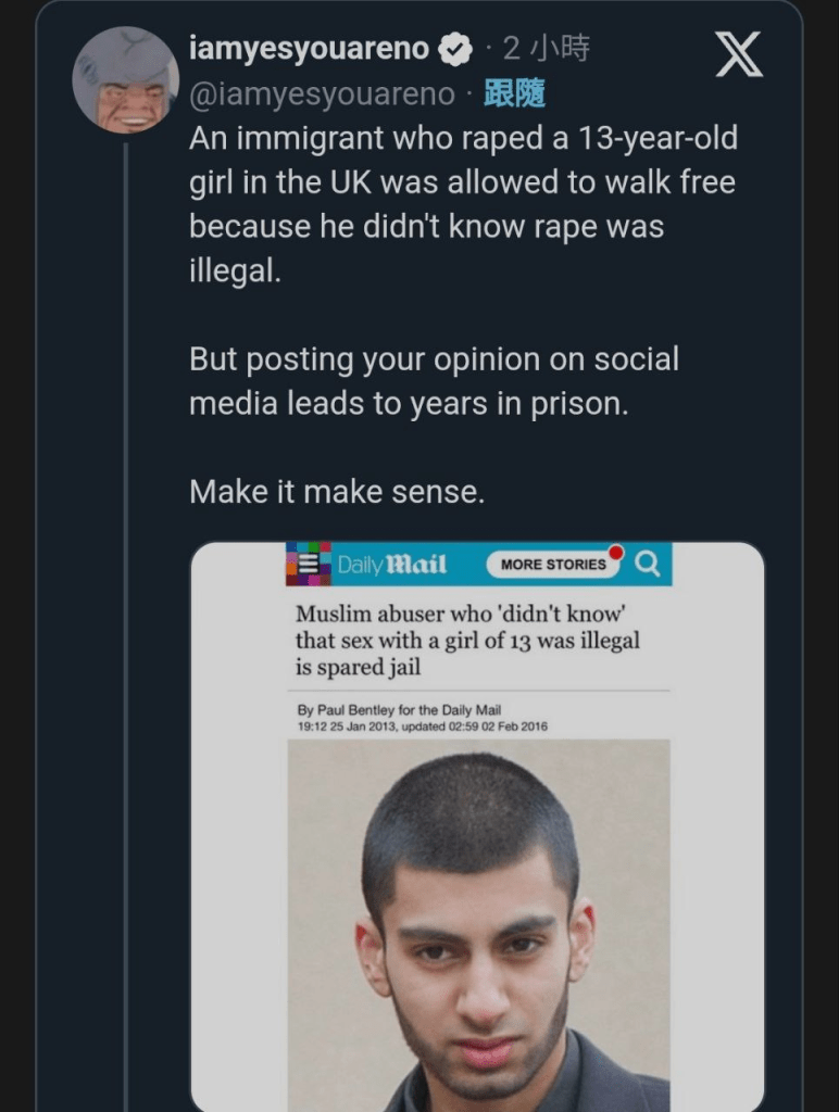 至於治安問題,近年多見不同社交媒體爆料說某時某地,有非法移民強姦本地女子,但警方往往都不作跟進。我難以考證事情真假,但是同樣道理,大眾的認知才是重點,只要年年月月都聽聞這種消息,厭惡情況例必累積。再加上司法又似乎確實存在不公現象,早在11年前,就曾經有18歲穆斯林強姦13歲女童後被判緩刑當庭釋放,原因是他自稱不知道與女童性交有罪。他更補充指自己其實抗拒與女童性交,但是他被女童誘惑(tempted by the girl)。當類似事情日積月累,但是本地人一發聲抗議就被判刑監禁,怒火怎能壓制住?