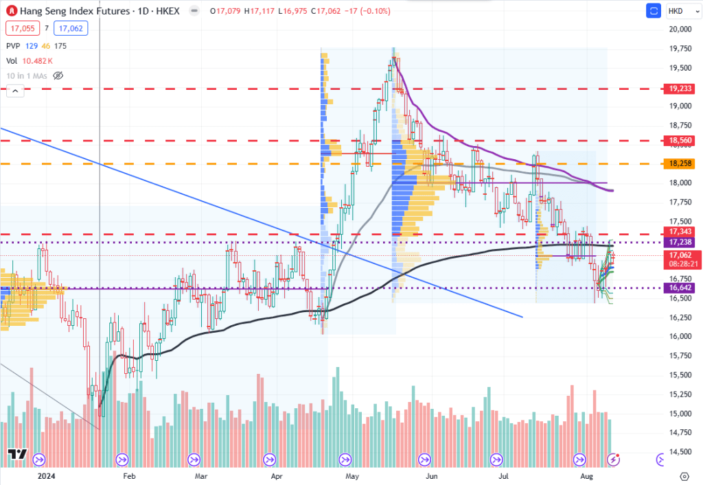 原諒上面期指幅圖比較亂,主要係要睇黑色條線。條黑線係由今年低位開始計嘅VWAP(Volume weighted average price)。假設個市場方向主力由庄家控制,咁呢條VWAP可以話係庄家嘅成本。而上星期五,高位曾經穿過黑線但企唔穩,短暫應該都做得比較差(港股都差左幾年)。咁啱今年現貨高低平均價係17250,上星期五高位就係17252。