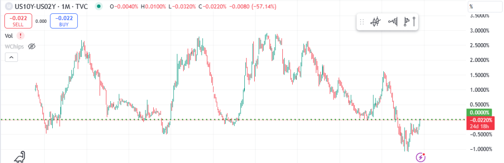 最後再貼埋美債十年腰同美債兩年腰嘅相差,剛剛由倒掛係咁易上一上正數,然後又負返少少。留意9月係咪企穩正數,係嘅話,又增加一個相當可靠嘅衰退兆頭。