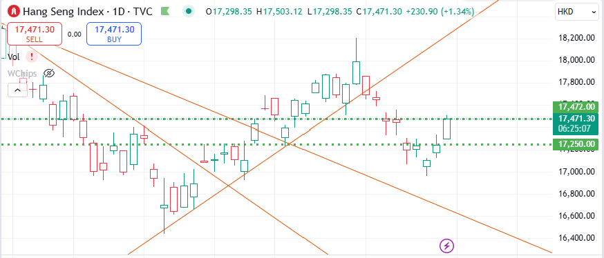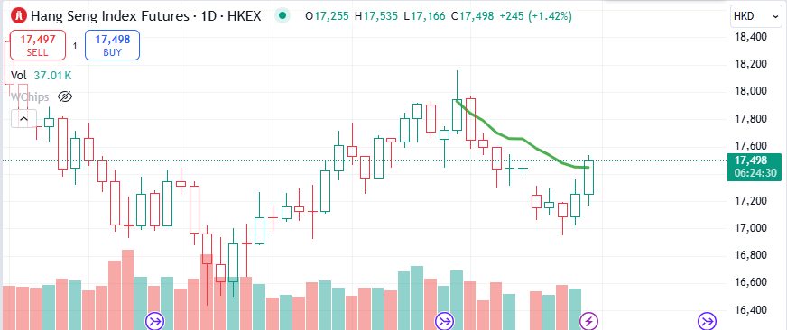 再講港股,cap圖時個市頂住17472,跟住好快個高位都破左;但到篇文出街時又低過17472。總之17472係另一關口,又係睇有無3日,有就萬八。再睇埋下圖,期指就睇佢企唔企17450樓上,呢個位係高位開始畫嘅VWAP位置,守到有望向上。目前就期指同現貨都喺呢啲關鍵位,怕嘅可以食糊。