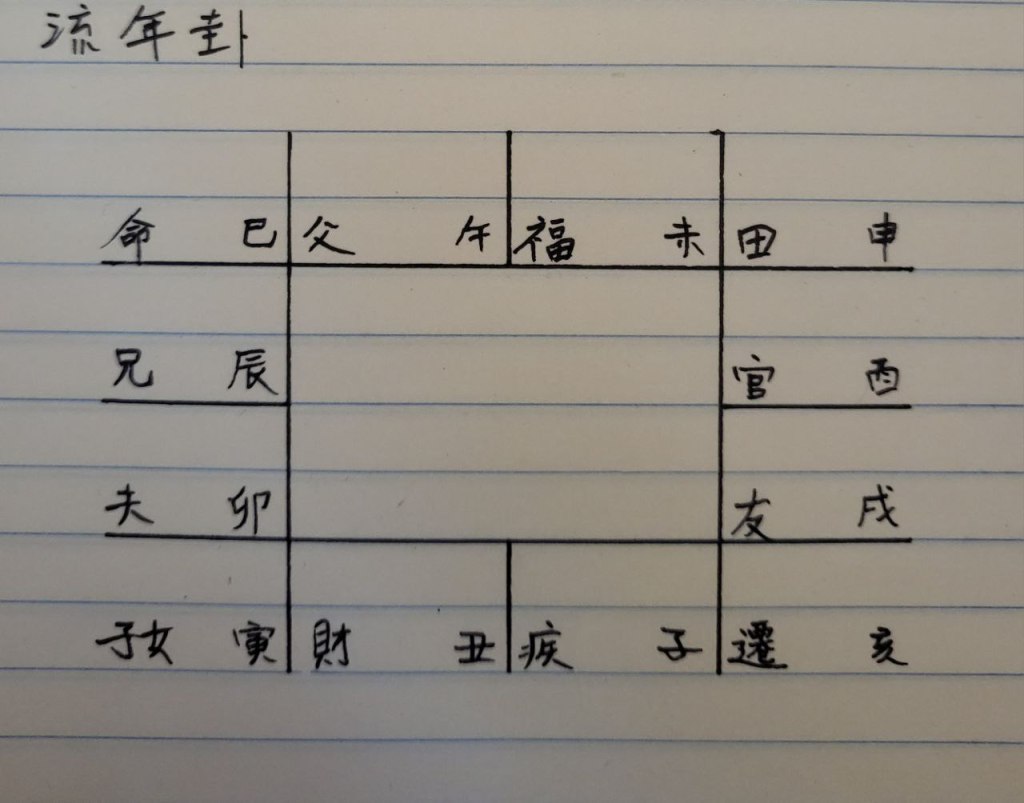 成件事好似紫微斗數咁,有十二宮位,分別係命宮、父母宮、福德宮、田宅宮、官祿宮、交友/僕役宮、遷移宮、疾厄宮、財帛宮、子女宮、夫妻宮、兄弟宮。排好宮位之後,我就拎副易經牌出黎抽,順序由命宮開始擺,然後順時針擺到兄弟宮*。